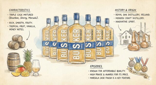 ・バスカーはそれぞれ異なったタイプの原酒をつかい、緑(混ぜているタイプ)、青(シングルモルト)、赤(グレーン)、灰色(シングルポットスチル)の4種類がリリースされている。