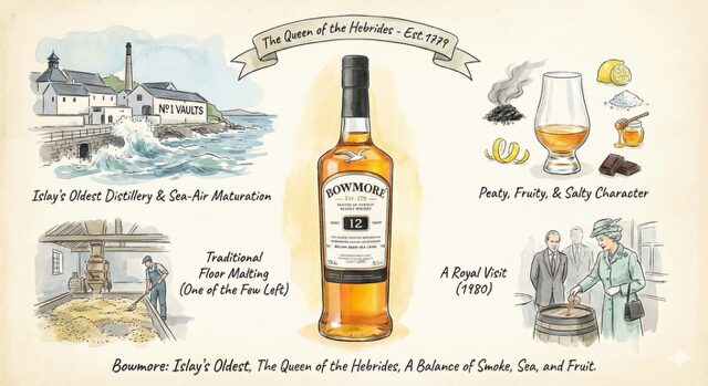 Bowmoreは1779年に設立された、アイラ島で最も古い現存蒸溜所であり、「アイラの女王」と呼ばれている。