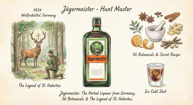 Jägermeister(イエーガーマイスター)は、ドイツ・ニーダーザクセン州ヴォルフェンビュッテルを拠点に、1934年に設立されたハーブリキュールブランドです。ブランド名 “Jägermeister” はドイツ語で「狩猟マスター(猟師長)」を意味し、狩猟文化と深く結びついたアイコン的存在となっています。