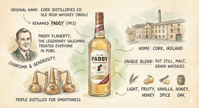 ・19世紀コーク生まれのウイスキーの名セールスマン「パディー・プラハリー氏」が売ったことから「パディーの酒」と呼ばれるようになり、ついに「パディー」と名付けられた。